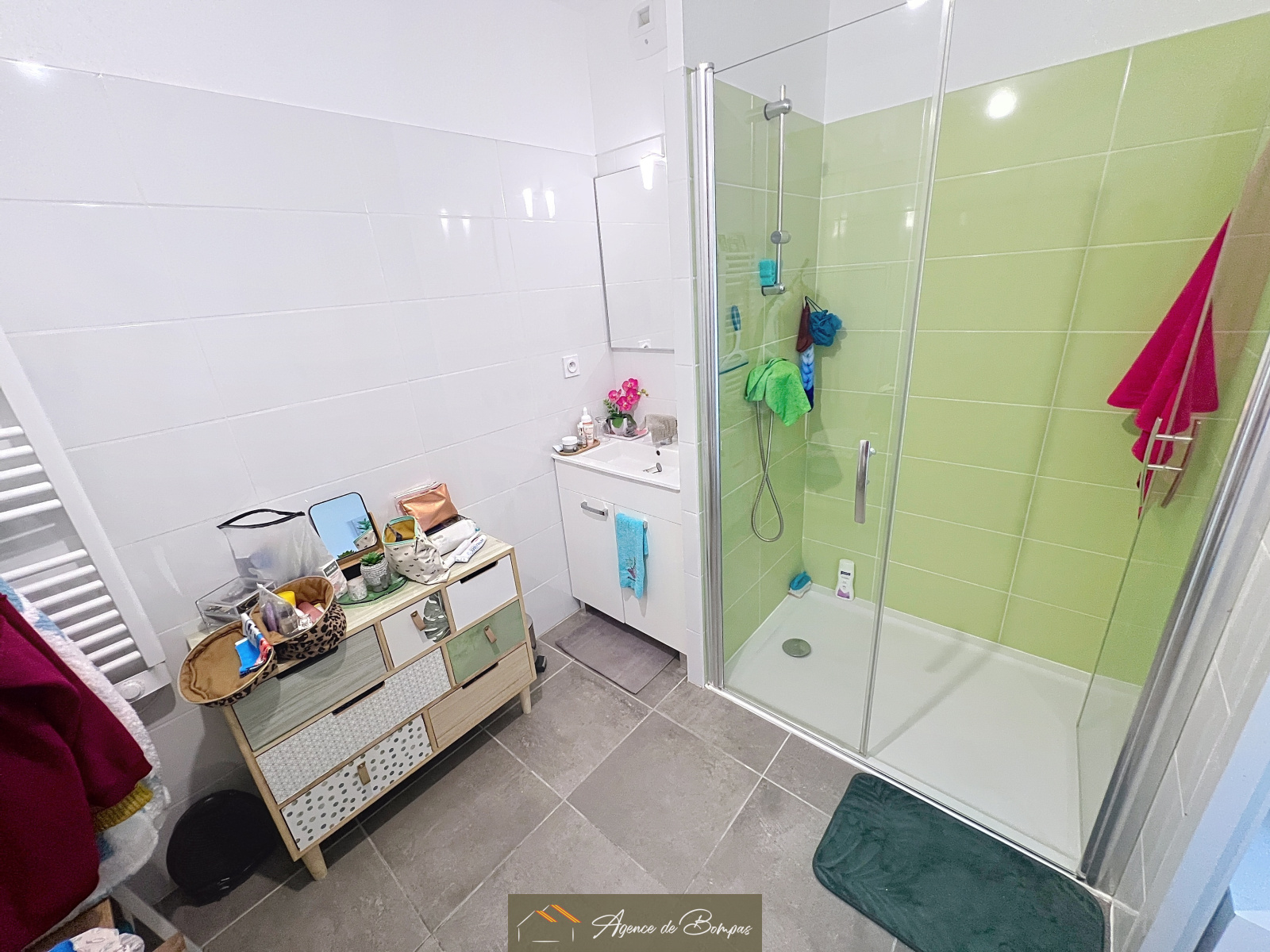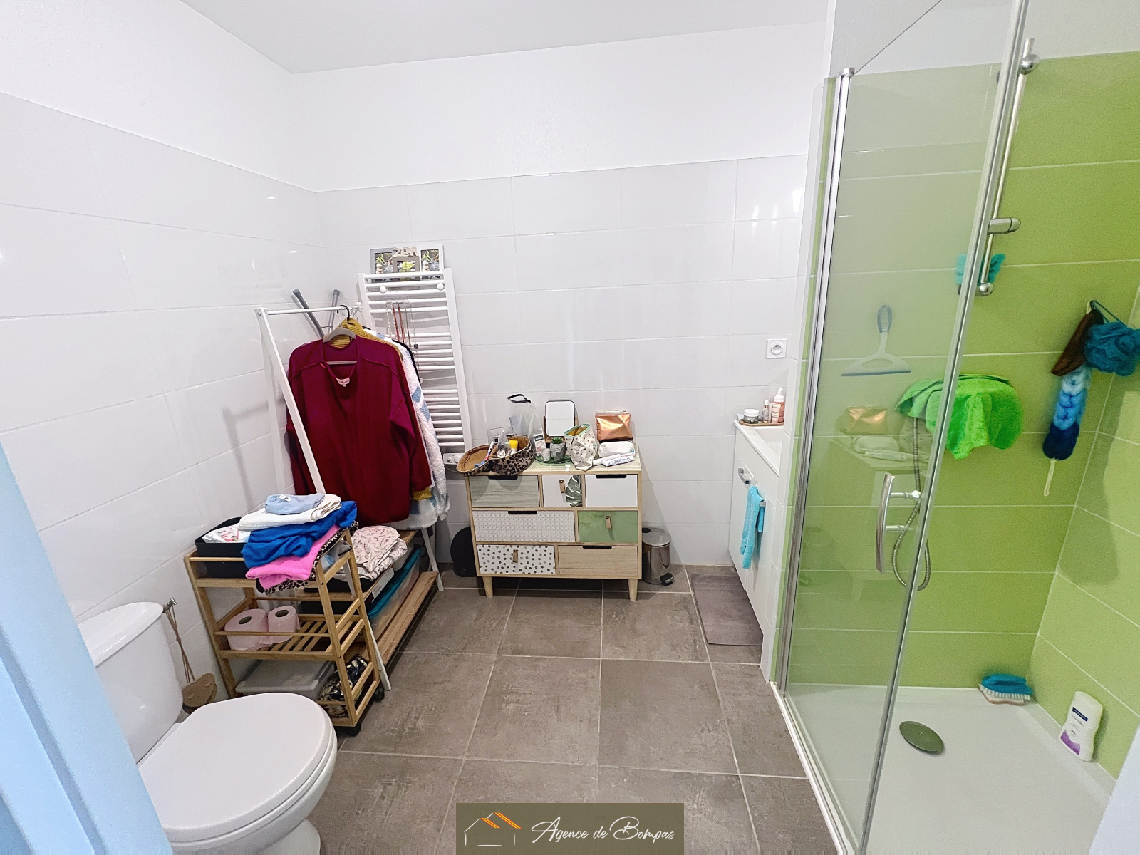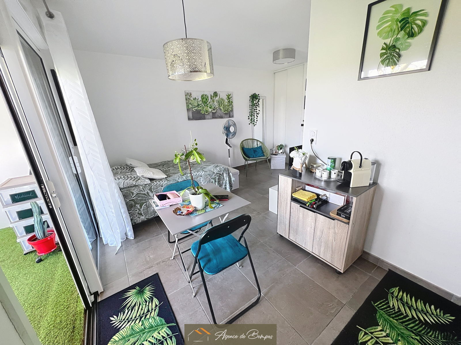 ENTREE -SEJOUR SALON AV CUISINE OUVERTE DONNANT SUR TERRASSE AVEC COIN CHAMBRE -SALLE D EAU AVEC TOILETTE- TERRASSE