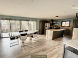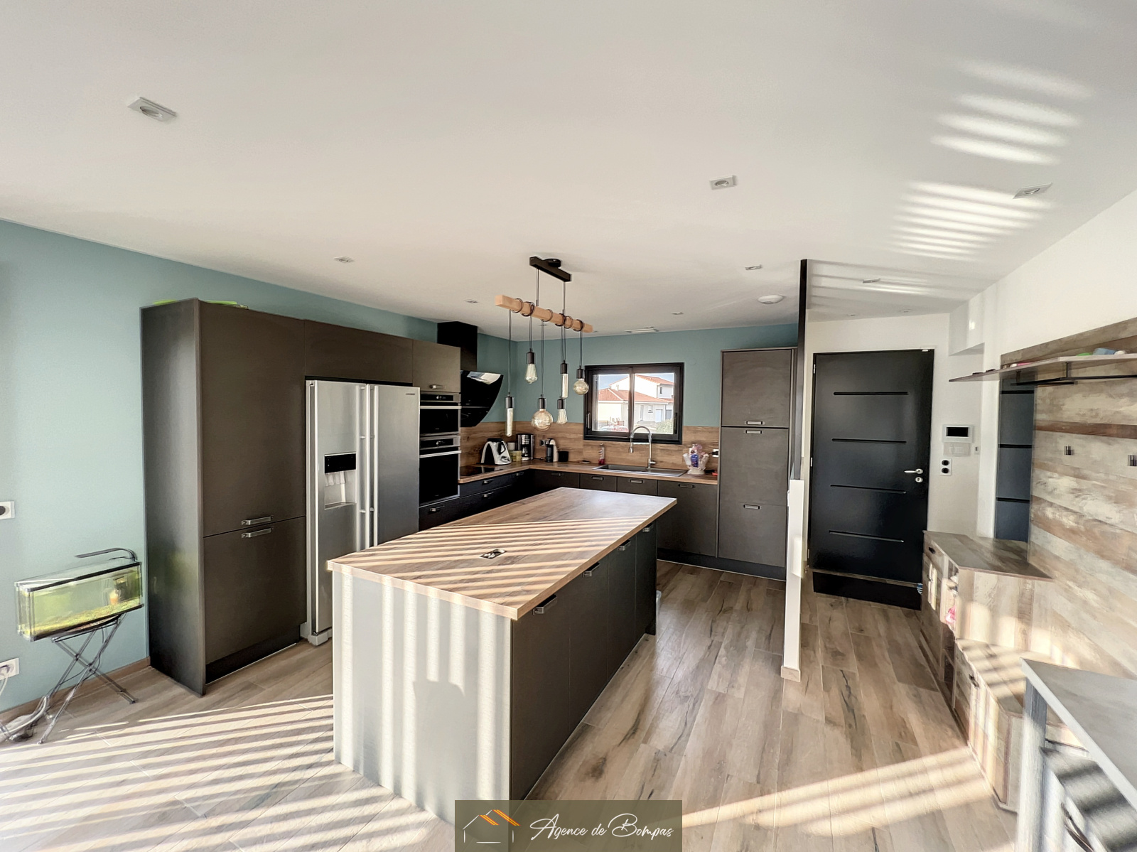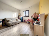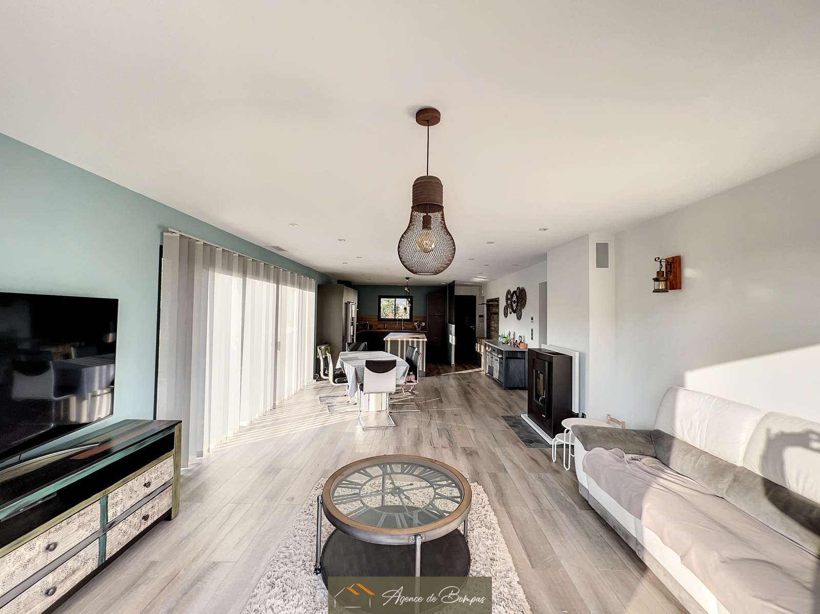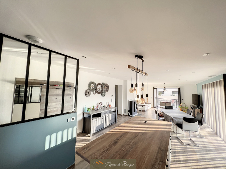 ENTREE DESSERVANT SEJOUR SALON ENVIRON 55 M2 AVEC POELE A GRANULE - CUISINE DINATOIRE OUVERTE DONNANT SUR TERRASSE SECURISEE PLEIN SUD - JARDIN ET PISCINE -1 CHAMBRE AV PLACARD - SALLE DEAU - BUANDERIE ET TOILETTE