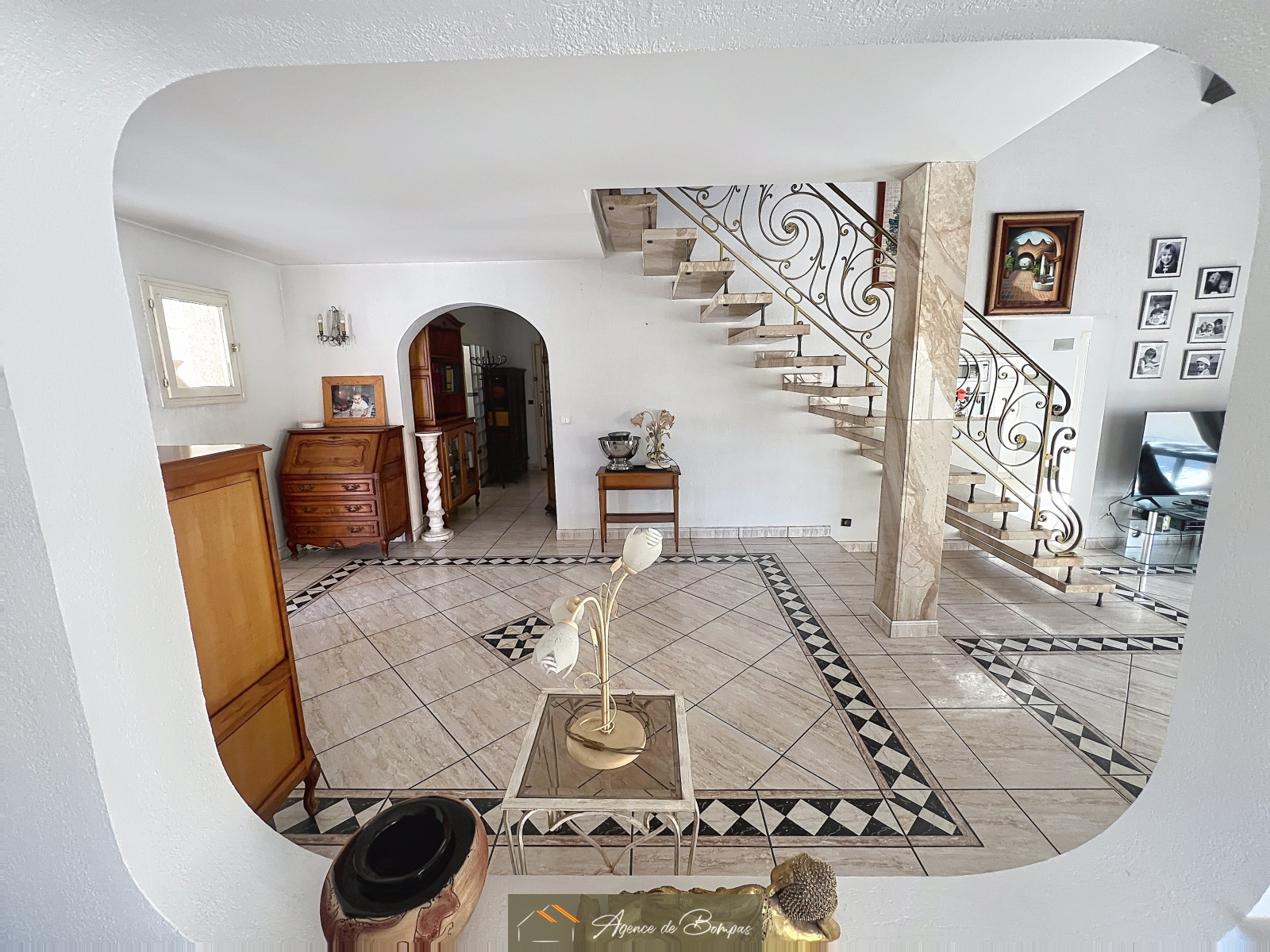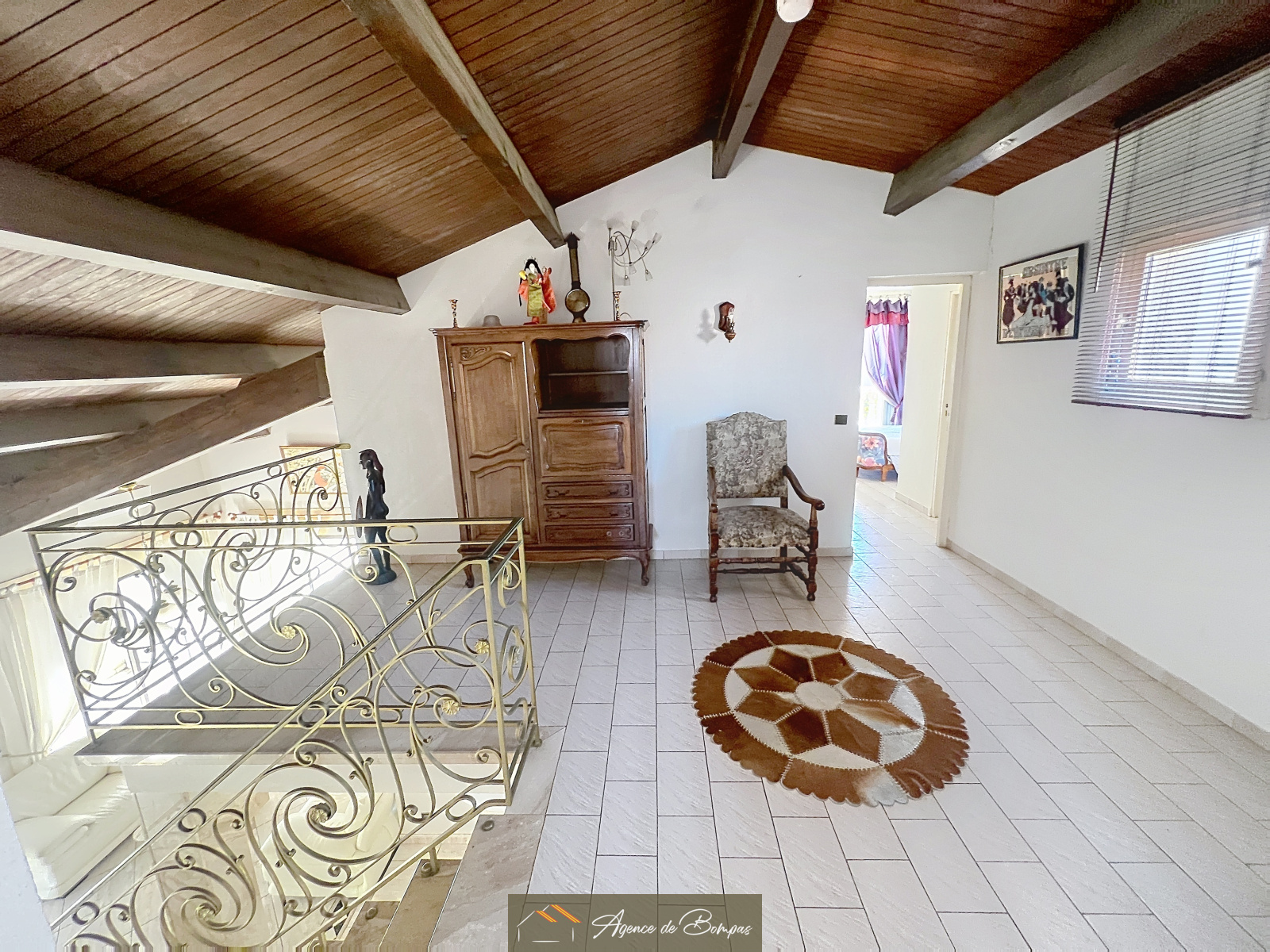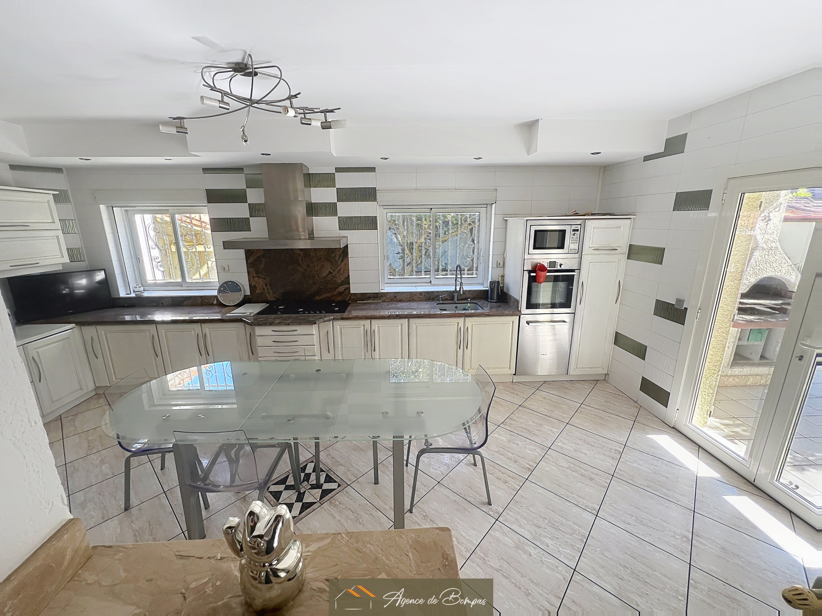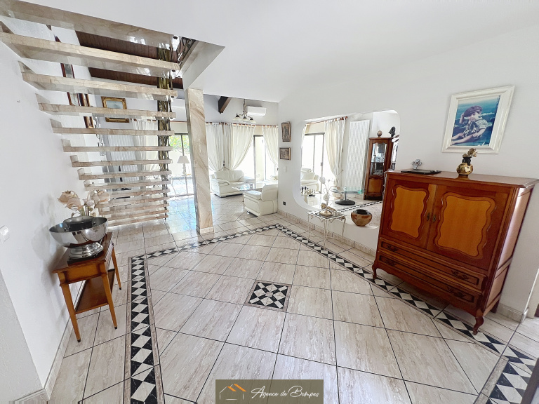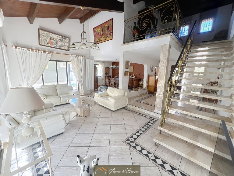 ENTREE DESSERVANT SEJOUR SALON AV PLAFOND MANSARDEE ENV 59 M2 DONNANT SUR VERANDA BIOCLIMATIQUE 20 M2 - CUISINE DINATOIRE 21.45 M2 DONNANT SUR GRANDE TERRASSE AVEC COIN BARBECUE ET PISCINE PLEIN SUD