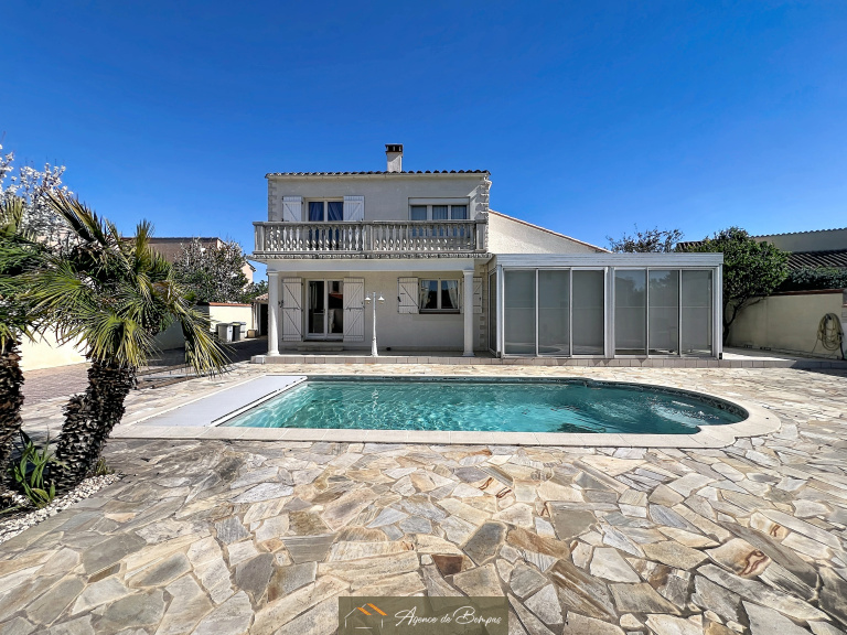 VILLA 4 FACES ENV 180 M2 HBTS SUR 858 M2 DE TERRAIN - PISCINE COQUE - CONSTRUCTION DE 1980 -FORAGE -CASOT - STATIONNEMENTS VEHICULES ET CAMPING CAR DEVANT GARAGES -TERRASSES -FORAGE-ARROSAGE AUTO - 2 GARAGES TRAVERSANTS 32 ET 28 M2- COIN BUANDERIE