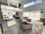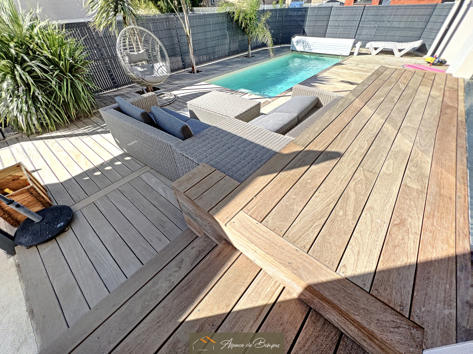 ELLE SE DECOMPOSE COMME SUIT : ENTREE DONNANT SUR SEJOUR SALON AV BELLE HAUTEUR SOUS PLAFOND ENV 58 M2 CUISINE AMERICAINE EQUIPEE DONNANT SUR TERRASSE EN BOIS DE TYPE CUMARU ET PISCINE COQUE PLEIN SUD - UNE SUITE PARENTALE AV DRESSING ET SALLE DEAU -TOILETTE AV LAVE MAIN -