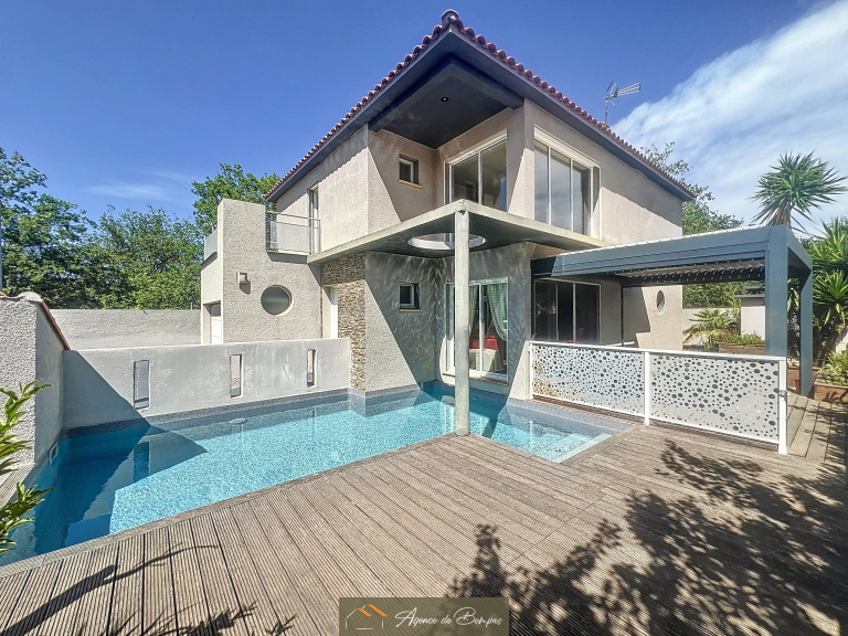 MAGNIFIQUE VILLA 4 FACES DE TYPE 6 EN R + 1 - 157 M2 HBTS SUR 452 M2 DE TERRAIN - PISCINE MACONNEE LINER EN PVC ARME 6.80 X 3.80 TRAITEMENT AU SEL -CUISINE D ETE COIN BARBECUE - ALLEE STATIONNEMENT VEHICULES PROTECTION AVEC VOILE D OMBRAGE - POSSIBILITE CAMPING CAR -CLIMATISATION GAIGNABLE REVERSIBLE - CHEMINEE INSERT BOIS DOUBLE FACE - GARAGE ENV 20 M2- PERGOLA BIOCLIMATIQUE MOTORISEE -ABRI DE JARDIN EN BOIS POUR RANGEMENT -MOUSTIQUAIRES - LOCAL TECHNIQUE PISCINE -