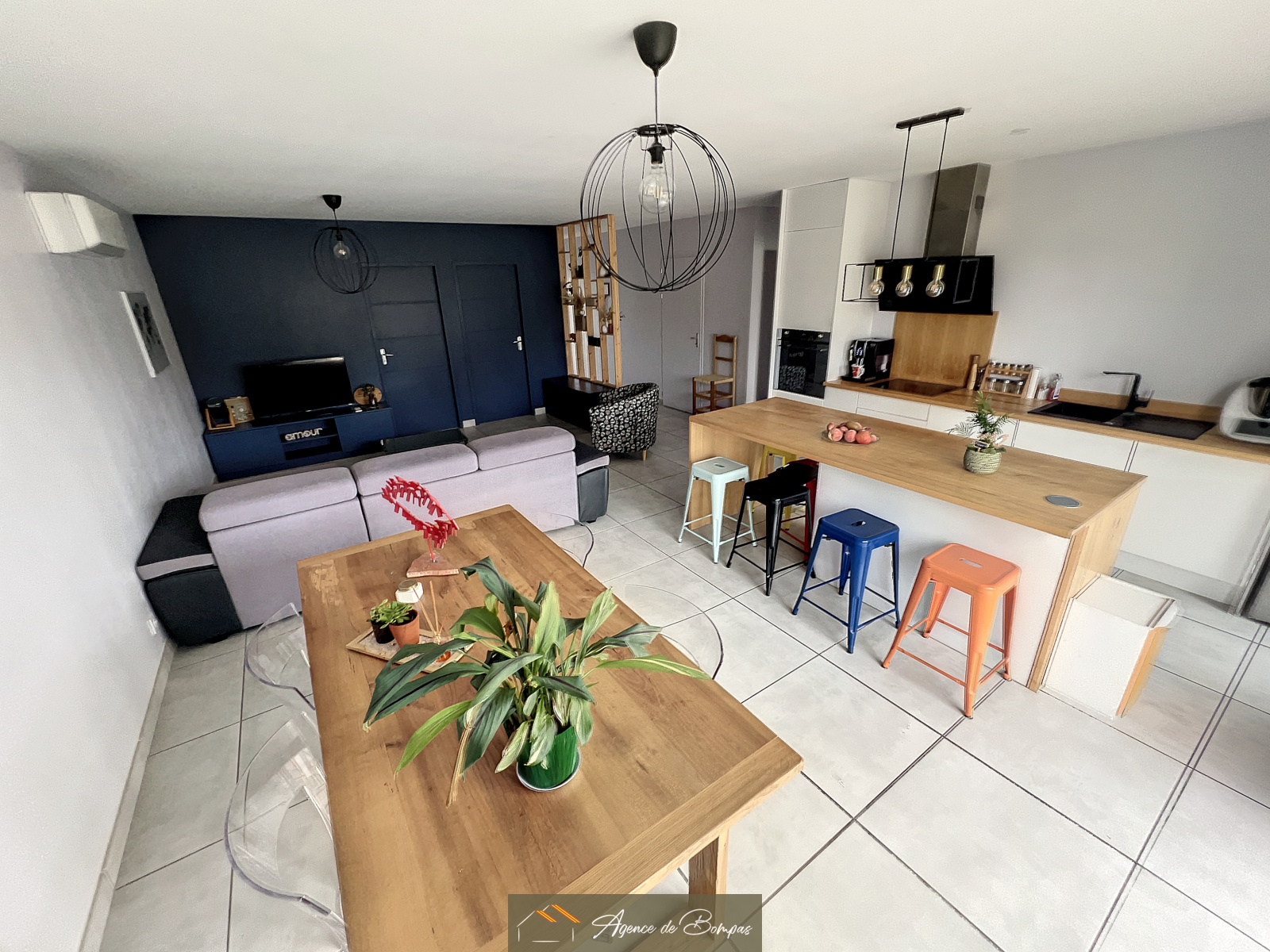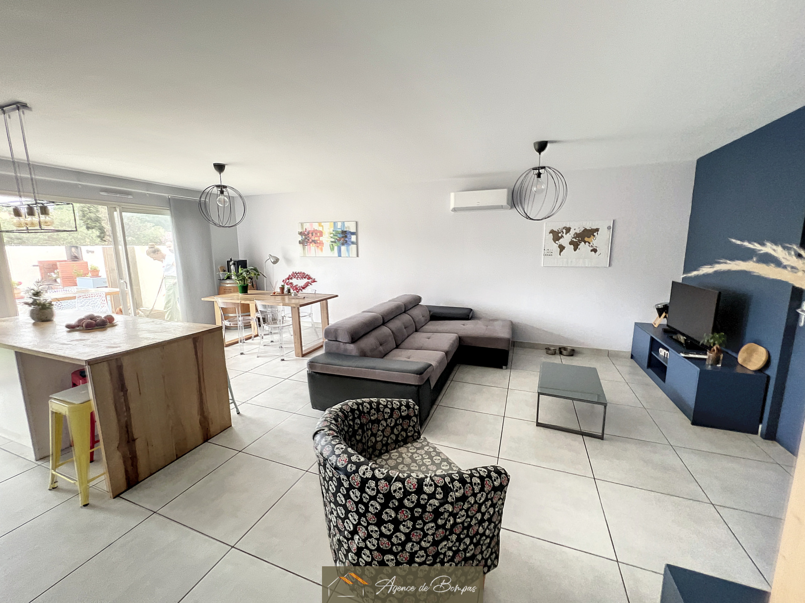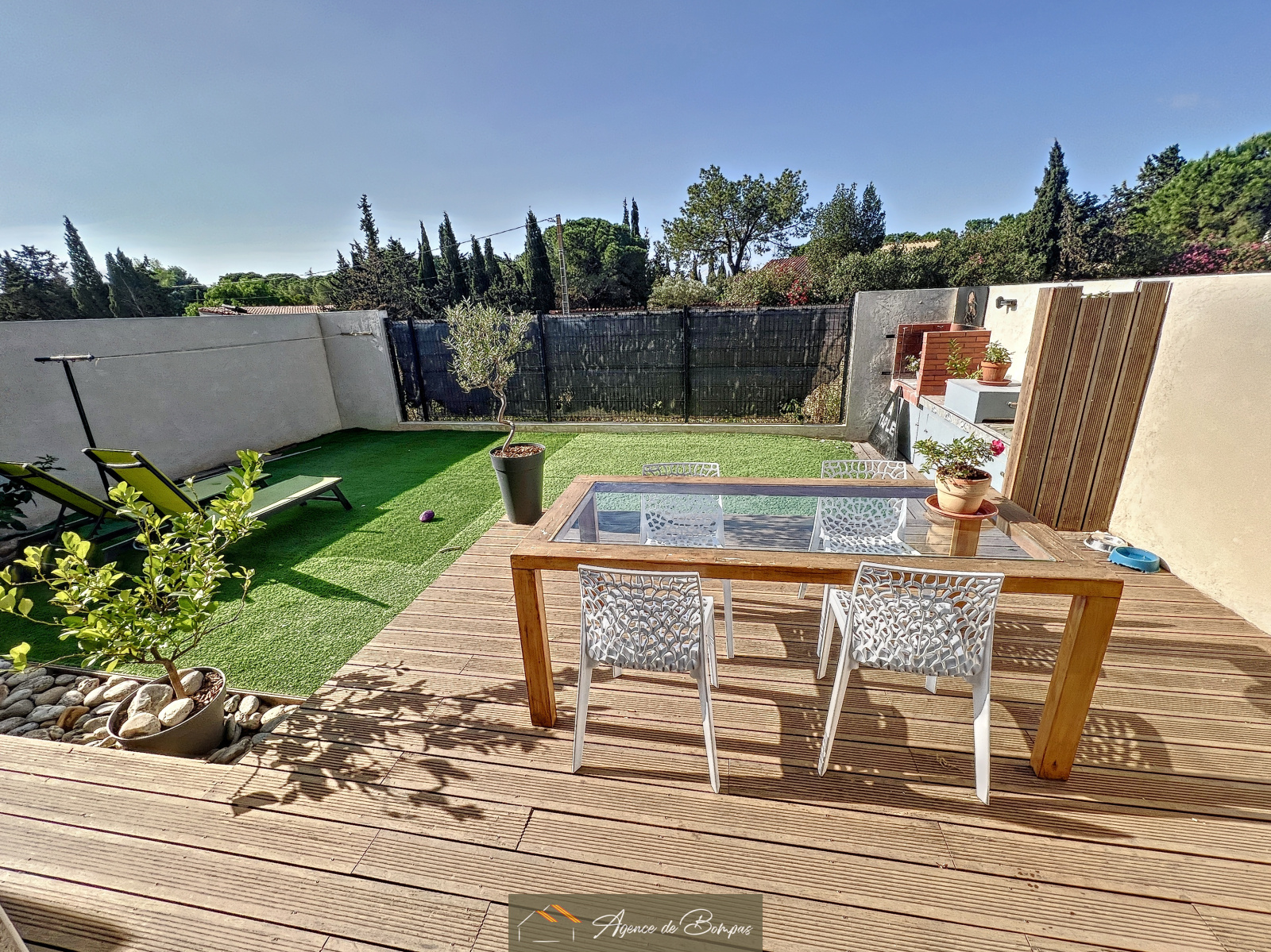 ENTREE DESSERVANT SEJOUR SALON CLIMATISE AV CUISINE EQUIPEE SMEG OUVERTE ENV 41 M2 DONNANT SUR TERRASSE AV COIN BARBECUE ET JARDIN PLEIN SUD SANS VIS A VIS - 2 CHAMBRES - SALLE DEAU AV PLACARD - TOILETTE