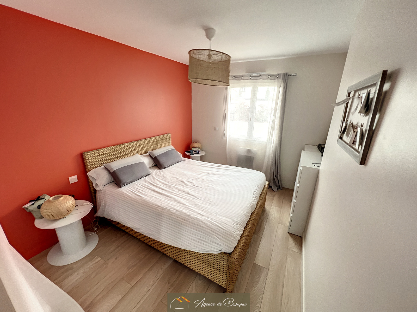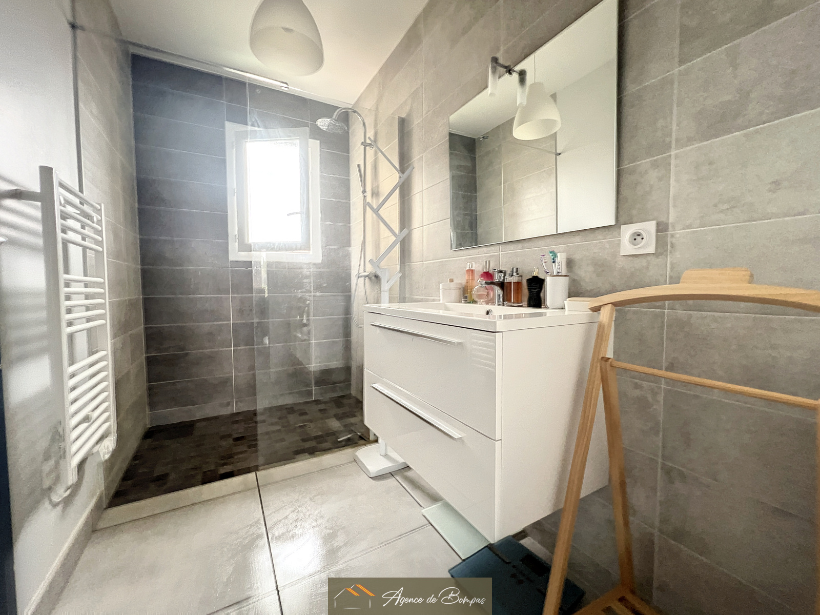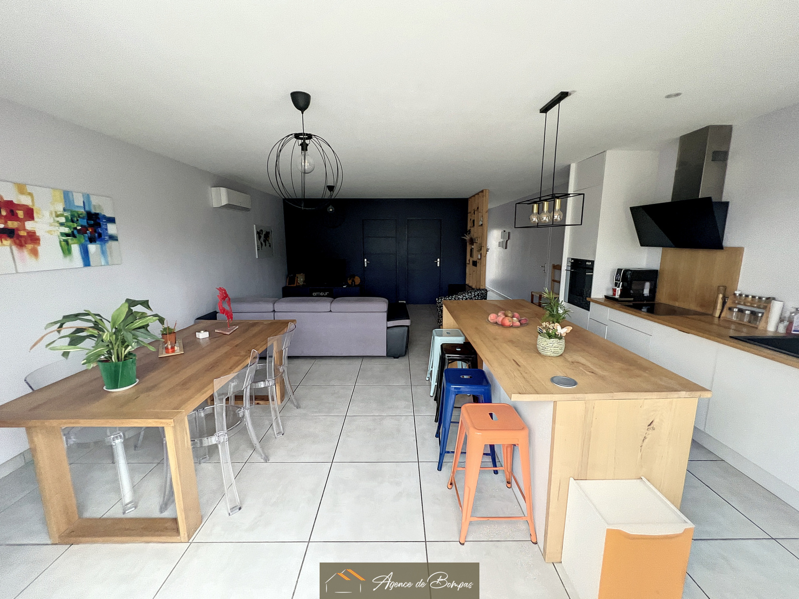 ENTREE DESSERVANT SEJOUR SALON CLIMATISE AV CUISINE EQUIPEE SMEG OUVERTE ENV 41 M2 DONNANT SUR TERRASSE AV COIN BARBECUE ET JARDIN PLEIN SUD SANS VIS A VIS - 2 CHAMBRES - SALLE DEAU AV PLACARD - TOILETTE